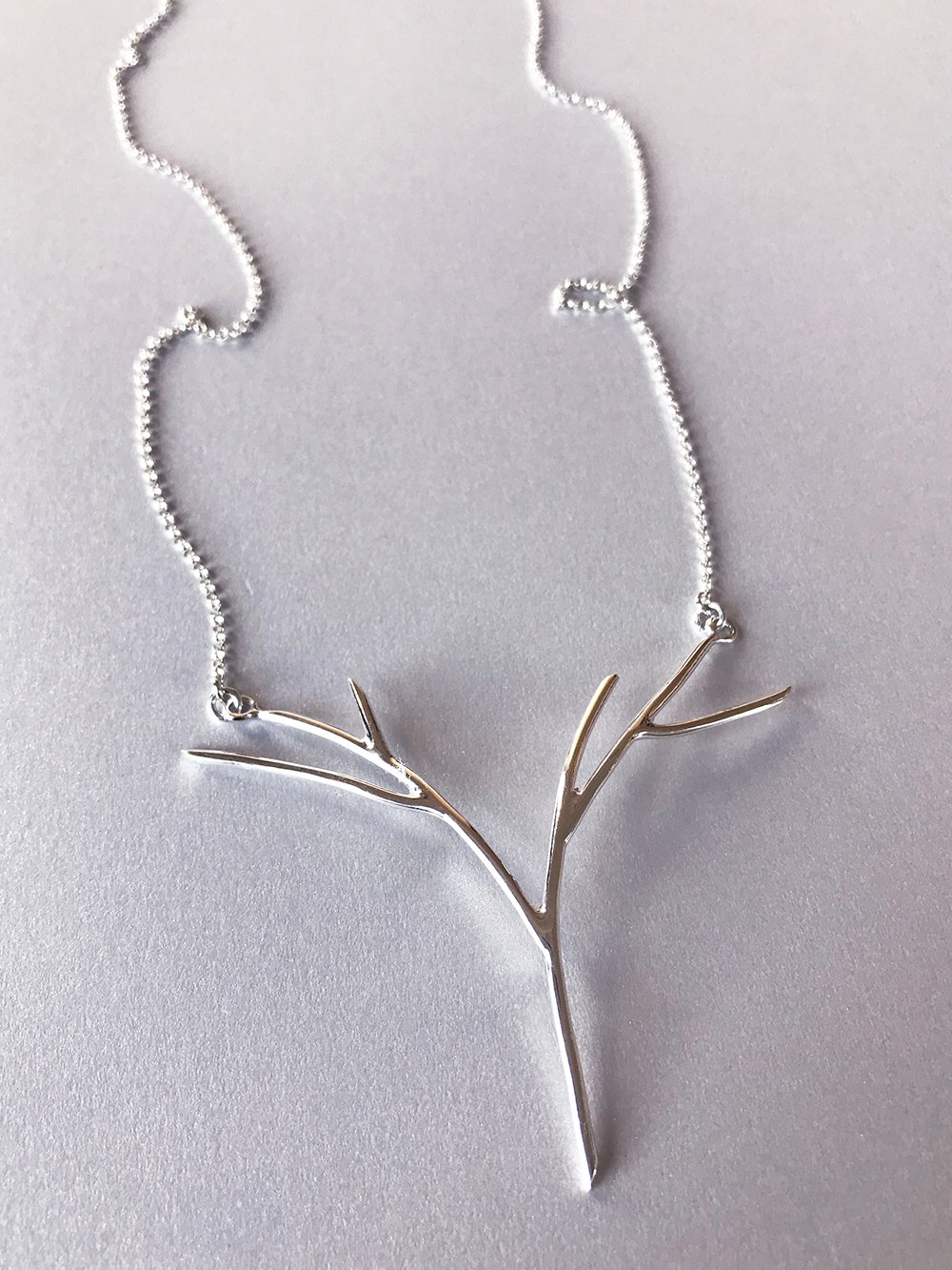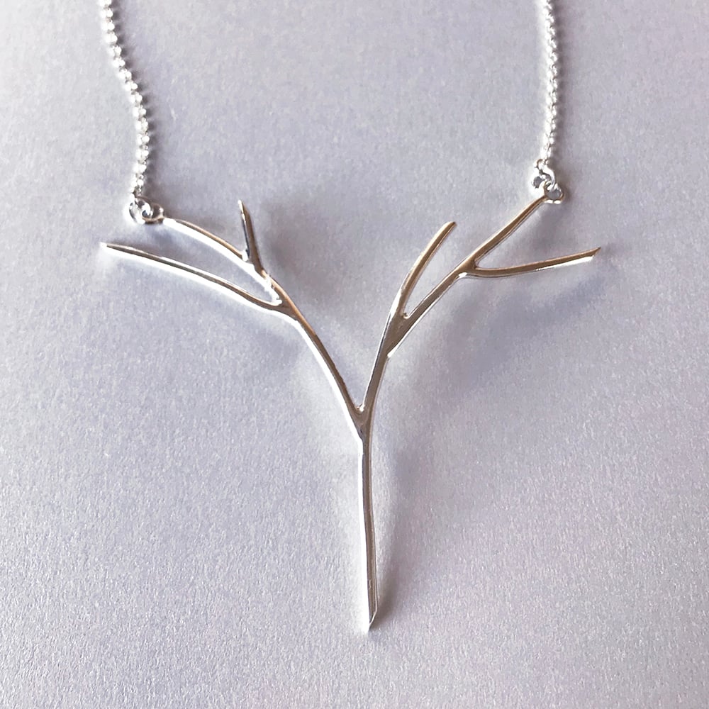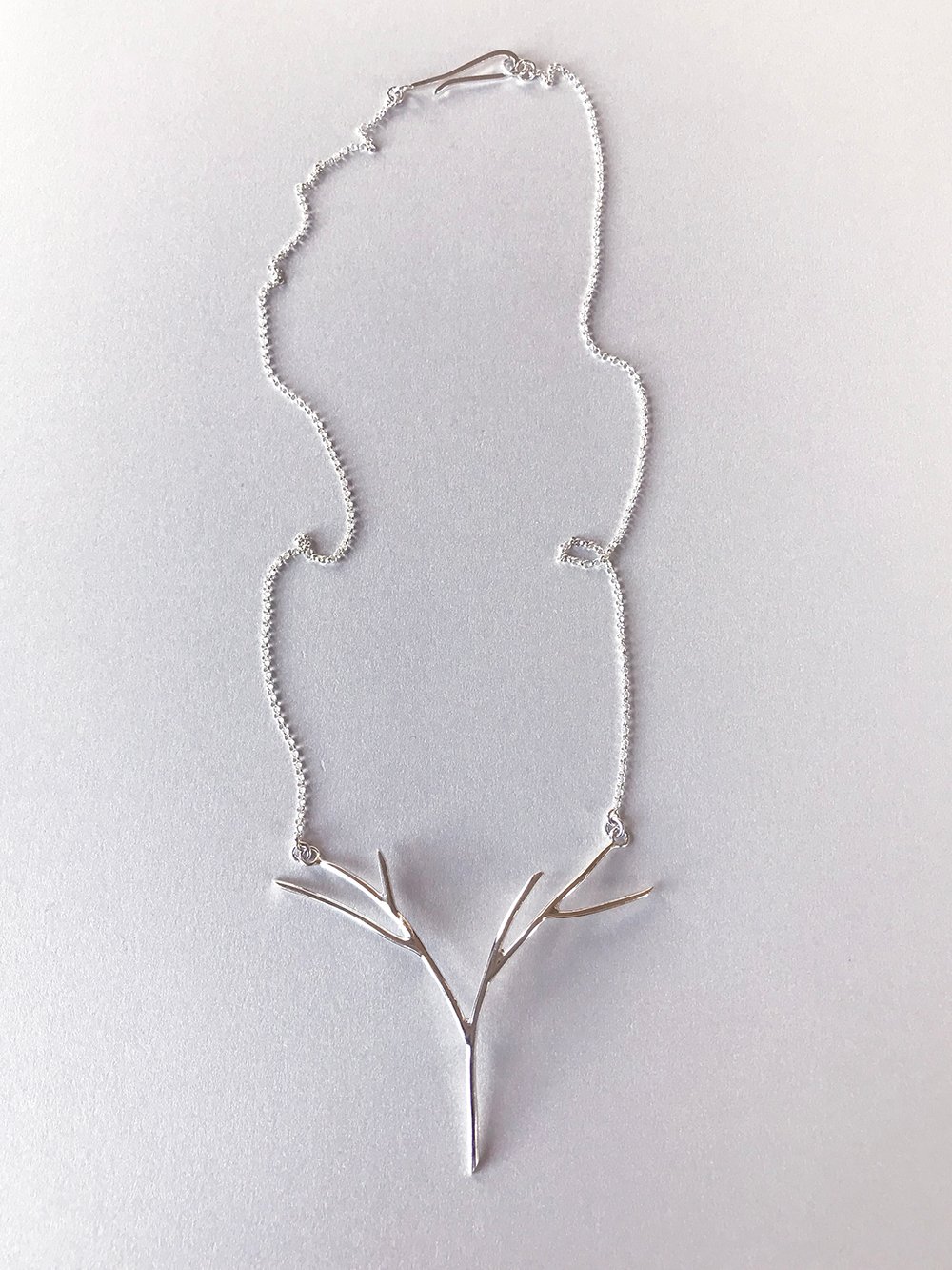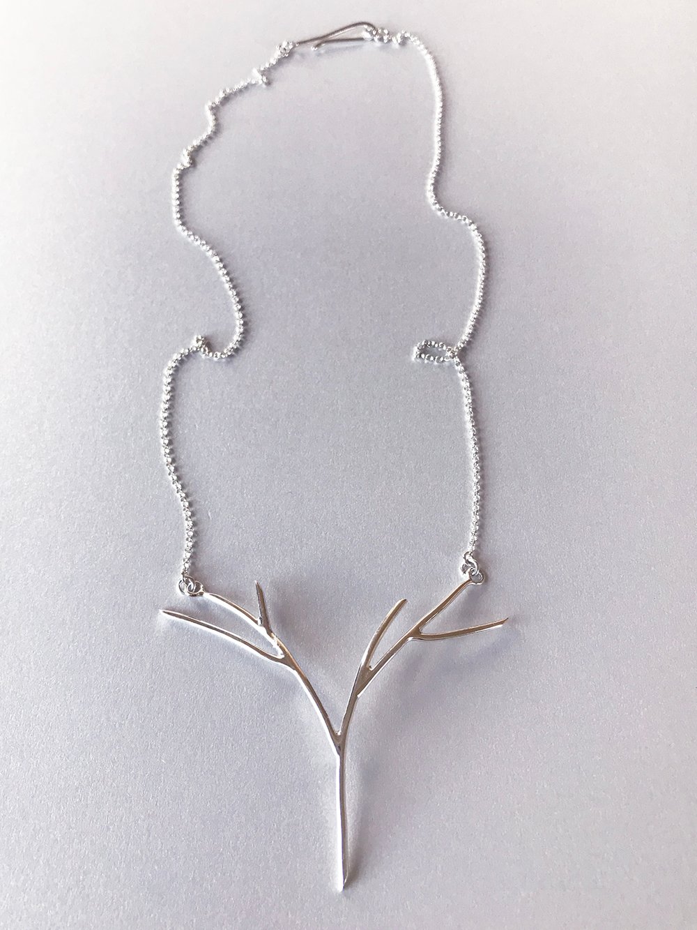 A minimal sketch of a tree in bright silver. The arching branches elegantly mirror the collarbones.