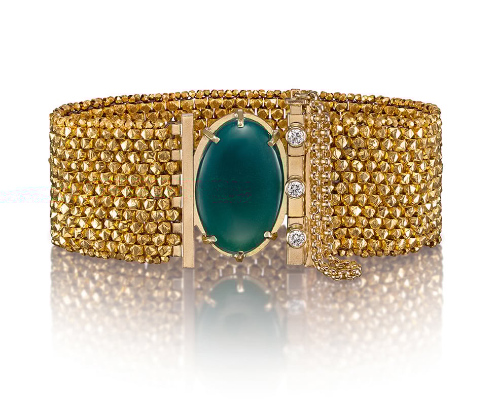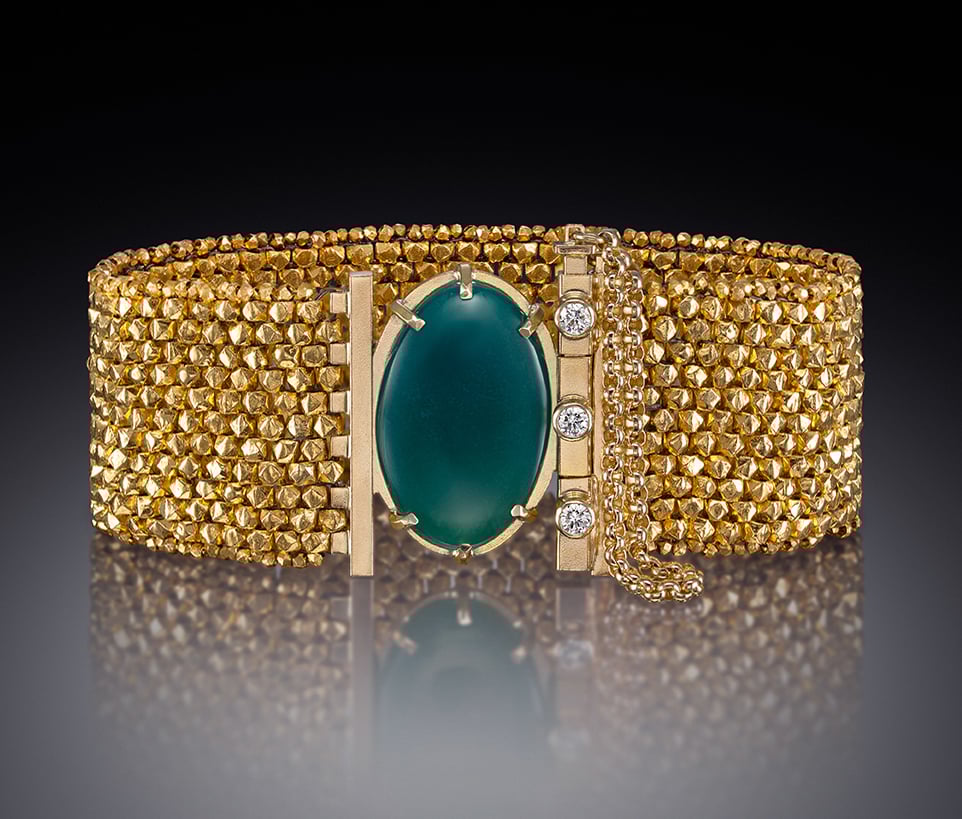 Woven gold, luminous gem silica, and a refined line of diamonds adorning the clasp.